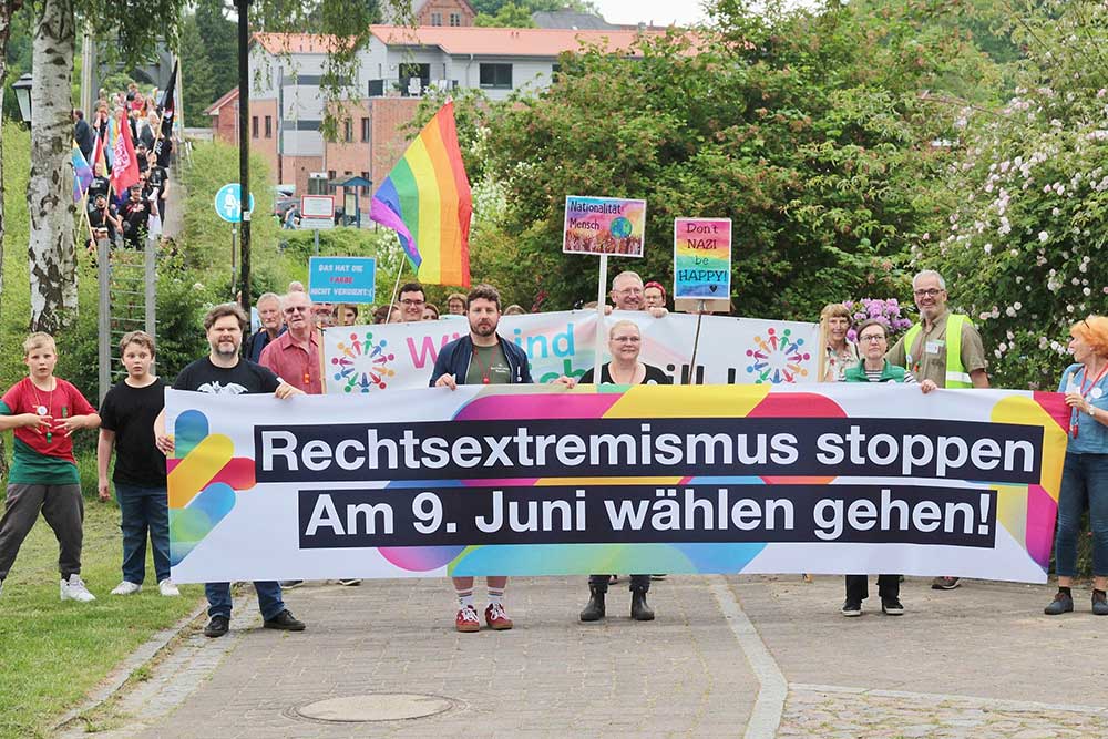 Dr. Wolfgang Runge, Pastor emeritus, war schon bei den vorausgegangenen Kundgebungen „Wir sind nicht still!“ engagiert dabei. Er appellierte, in den Dörfern keine Spaltungen und Menschenverachtungen zuzulassen. „Sachlichkeit und Einfühlungsvermögen sind unser Weg“, sagte er und erhielt starken Applaus. Zufrieden mit der Beteiligung an der Demonstration und der sich anschließenden Kundgebung, erläuterte Dr. Runge, dass aufgrund der anstehenden Wahl zum Europäischen Parlament am 9. Juni es den Veranstaltenden wichtig war, rechtzeitig vor der Wahl ein Zeichen zu setzen und sich nicht erst wieder am Reformationstag erneut zu den demokratischen Werten zu bekennen.