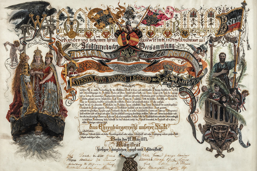 Aumühle (LOZ). Eine geflügelte Putte mit Pickelhaube, eine andere mit leerem Sektglas und ein finster blickender Kaiser Barbarossa gehören zu den vielen Details, die sich auf dem Ehrenbürgerbrief Berlins für Otto von Bismarck entdecken lassen. Diese Urkunde war 1871 als Auftragsarbeit an den Maler Adolph Menzel (1815 – 1905) vergeben worden, der sie voller Anspielungen und nicht ohne Ironie ausführte.