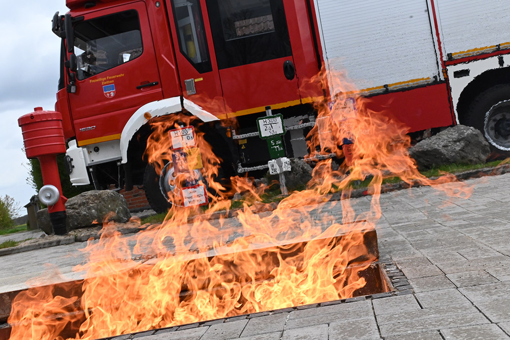 In der Übungsanlage wurde ein Breitbandschacht mit integriertem Brenner auf Propangasbasis eingebaut. Jetzt ist es nun möglich, Löschtaktiken realer Brandverläufe mit Übungslöschern zu beüben.