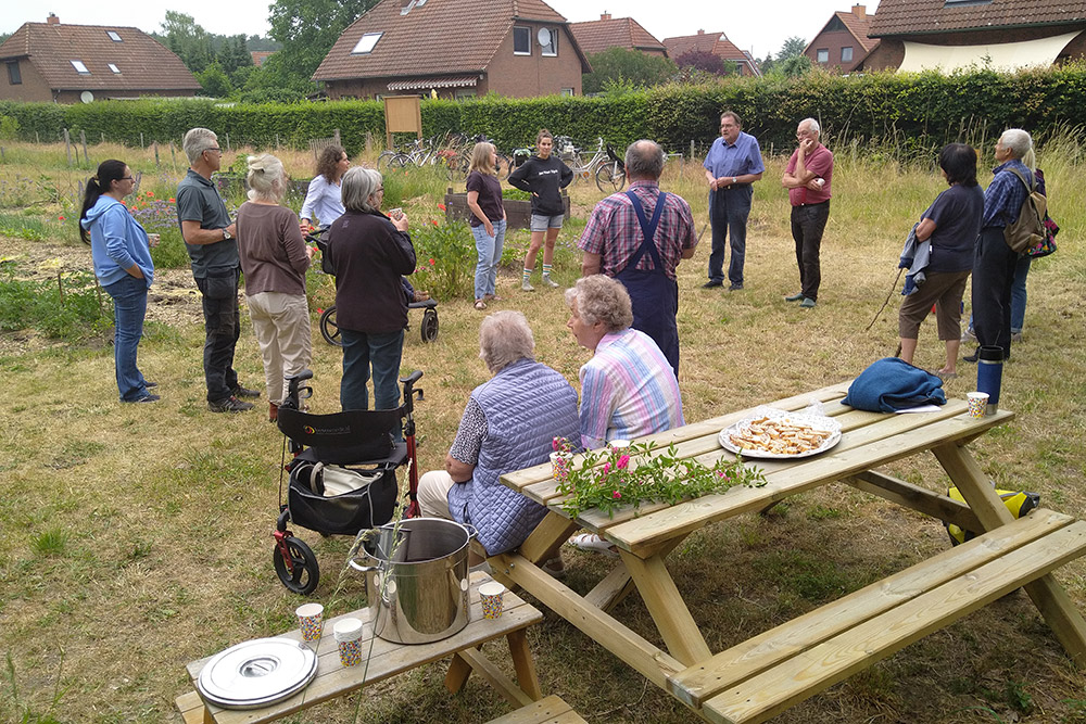 Ein geplantes Highlight war der Besuch des Bürgermeisters Uwe Möller und schnell entstand ein großer Gesprächskreis. Peter Grunwald erläuterte spontan die Entwicklung und den Fortschritt des Gröönlandes. Immerhin ackern dieses Jahr fast doppelt so viele Mitglieder, wie im letzten Jahr und die Gemeinschaftselemente gehen gut voran in der Umsetzung. Auch die Waldkita belebt und nutzt den Acker für die Kinder. Am Ende des Vortrags bedankten sich die anwesenden Mitglieder bei der Gemeinde für die Unterstützung und besonders lobend wurden die Mitarbeitenden des Bauhofes erwähnt, welche bereits von Beginn an mit Wasser, Arbeitskraft und Gerät ausgeholfen haben.