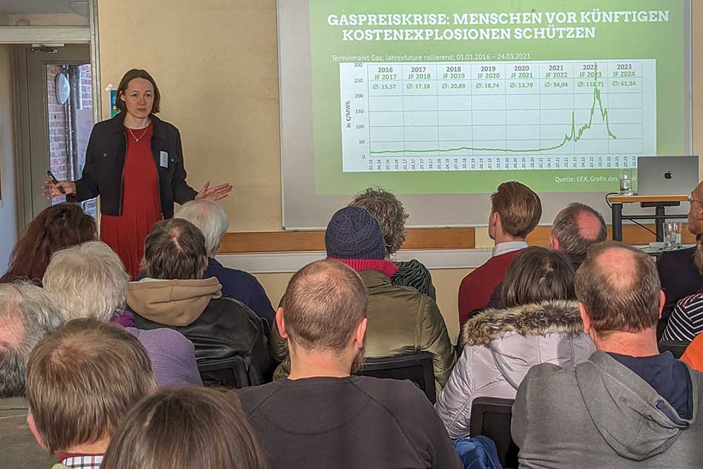 Dr. Ingrid Nestle, grüne Bundestagsabgeordnete, gab eine politische Einordnung des Heizungsgesetzes und erläuterte die Fakten, die die Notwendigkeit einer Dekarbonisierung der Wärmeversorgung unterstreichen.
