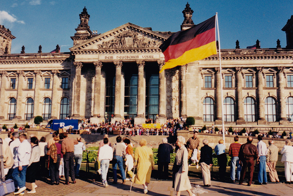 Feier zur Wiedervereinigung vor dem Reichstagsgebäude in Berlin am 3. Oktober 1990. Foto: Heike Fischer