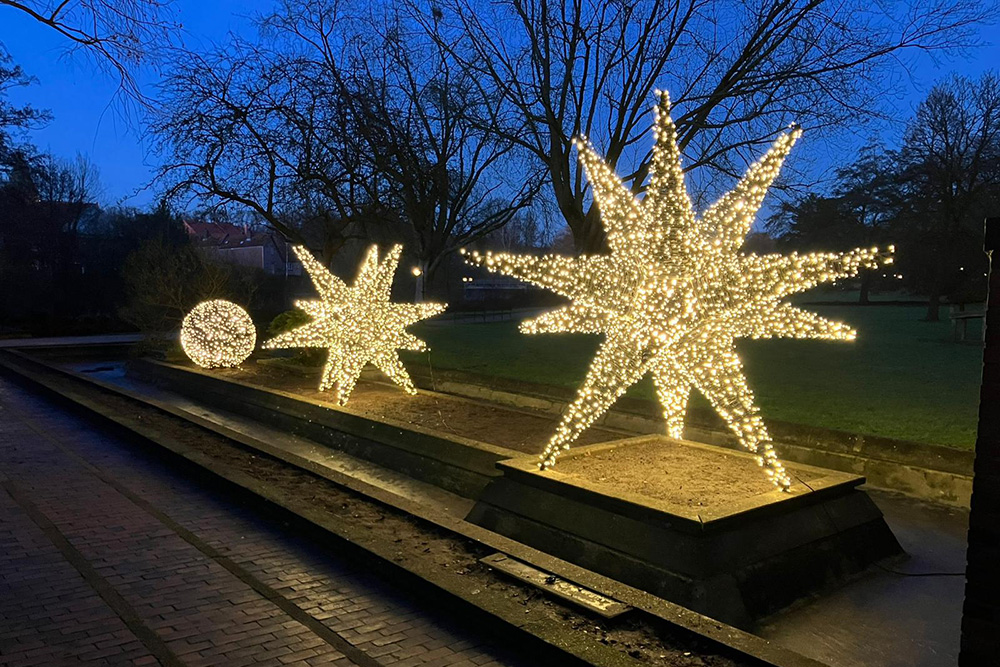 Im Kurpark sorgen seit wenigen Tagen die neuen, beleuchteten Sterne und Kugeln für stimmungsvolle Lichtpunkte. Auch diese Lichtelemente wurden im Rahmen des Förderprojekts Innenstadtentwicklung angeschafft und werten den Kurpark in der dunklen Jahreszeit auf.