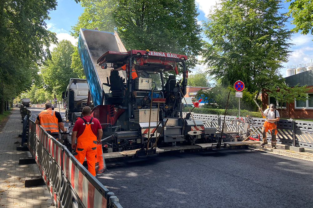 Fast zeitgleich begannen auch die Fahrbahnsanierungsarbeiten in der Heinrich-Hertz-Straße. Diese waren wesentlich umfangreicher. In zwei Sanierungsabschnitten wurde auf der gesamten Straßenlänge der alte Belag abgefräst und in mehreren Schritten eine neue Fahrbahndecke aufgebracht. Der Verkehr wurde dabei in einer Einbahnstraßenregelung in Richtung Robert-Bosch-Straße an der Baustelle vorbeigeführt und musste nur an jeweils zwei Tagen, während des Abfräsens der alten Fahrbahndecke in den Abendstunden und des anschließenden Einbaus der neuen Deckschicht, voll gesperrt werden. Hier spielte das Wetter ideal mit, sodass es zu keiner wesentlichen Verzögerung der geplanten Arbeiten kam.